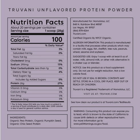 Truvani Unflavored Plant Protein Powder, 19.75oz.