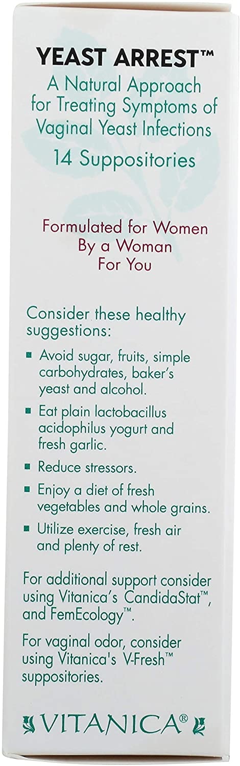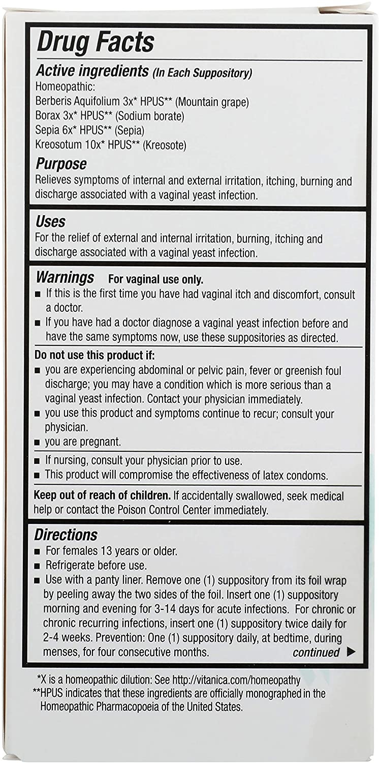 Effective natural homeopathic vaginal suppository for symptoms associated with vaginal yeast infections. Relieves burning, itching and discharge